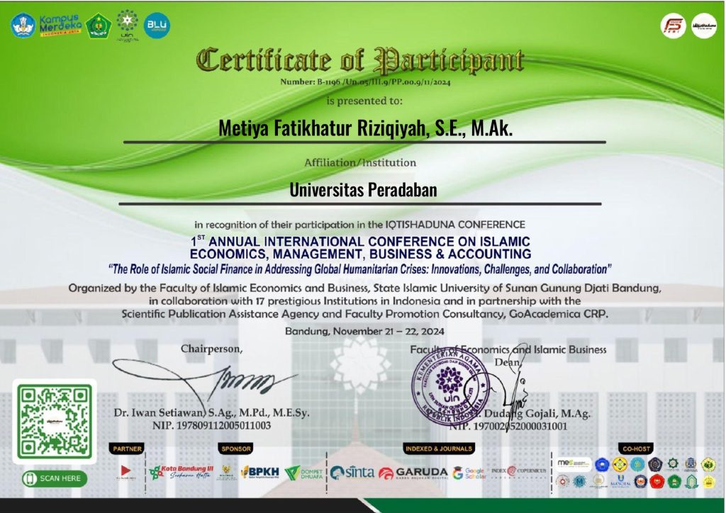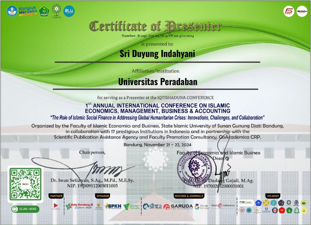 Mahasiswa Program Studi Akuntansi Universitas Peradaban, Sri Duyung Indahyani, berhasil berpartisipasi sebagai presenter dalam ajang internasional IQTISHADUNA: 1st Annual International Conference on Islamic Economics, Management, Business & Accounting. Konferensi ini mengangkat tema “The Role of Islamic Social Finance in Addressing Global Humanitarian Crises: Innovations, Challenges, and Collaboration.”