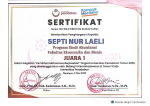 Prestasi membanggakan kembali diraih oleh mahasiswa Program Studi Akuntansi Fakultas Ekonomika dan Bisnis Universitas Peradaban. Septi Nur Laeli, mahasiswa Prodi Akuntansi, berhasil meraih Juara 1 dalam ajang Pemilihan Mahasiswa Berprestasi (PILMAPRES) tingkat Universitas Peradaban Tahun 2025. Penghargaan tersebut diberikan dalam Read more