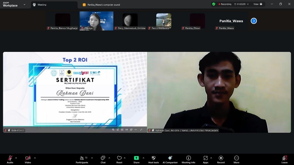 Prestasi membanggakan kembali diraih oleh mahasiswa Program Studi Akuntansi Fakultas Ekonomika dan Bisnis Universitas Peradaban. Rahman Dani, mahasiswa Akuntansi angkatan 2022, berhasil meraih Juara 2 dalam ajang Online Trading Competition SMARTVEST 2025 yang diselenggarakan oleh Investor Club Fakultas Ekonomi dan Bisnis Universitas Sebelas Maret (UNS).
